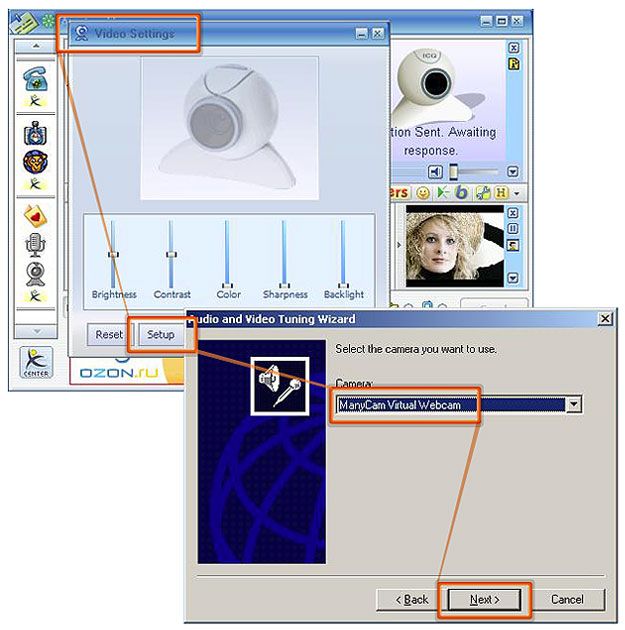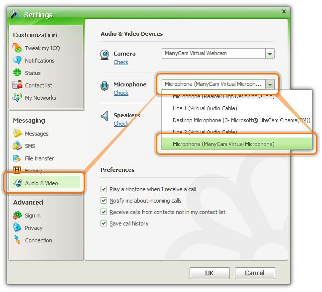 In ICQ, open "Audio & Video Devices" (Main menu - Settings), click on the "Camera" dropdown list and select "ManyCam Virtual Webcam". Alternatively, open the user's window and click on the camera icon (Video chat). In the Video Call window that appears, press "Menu", choose "Audio and video device settings", find the "Camera tab" and choose "ManyCam Virtual Webcam".