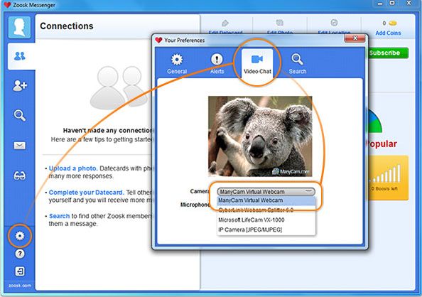 Click on the settings menu icon in the left bottom corner and go to the Video Chat tab in the appeared window. Select "ManyCam virtual Webcam" in the Camera dropdown list